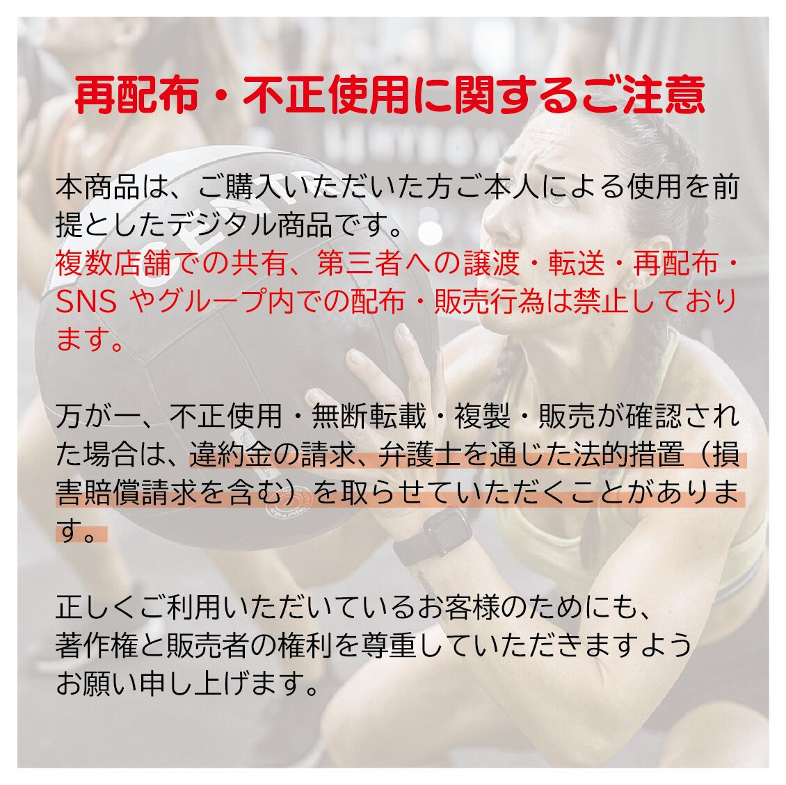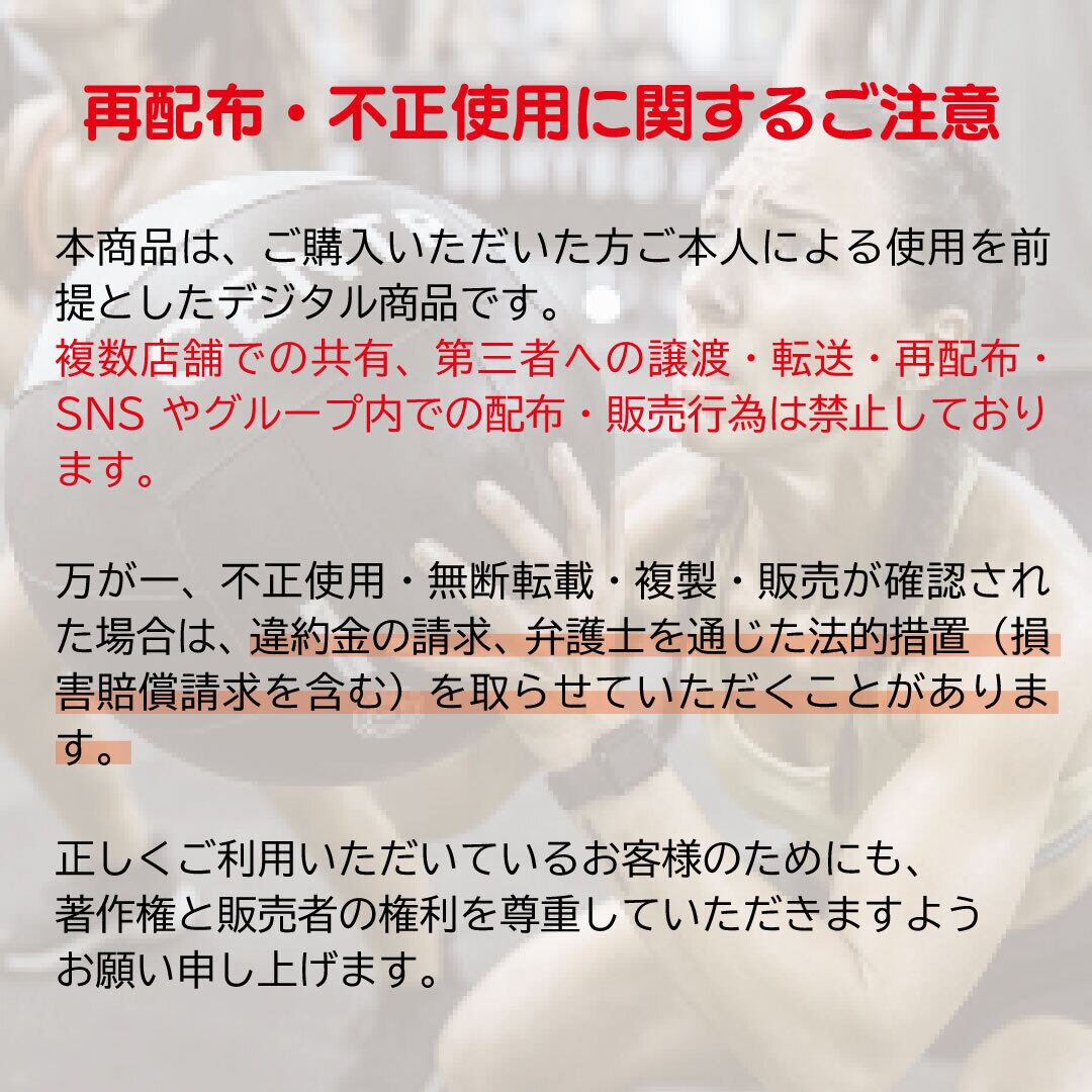 複数店舗での共有、第三者への譲渡・転載・再配布・SNSやグループ内での配布・販売は禁止です