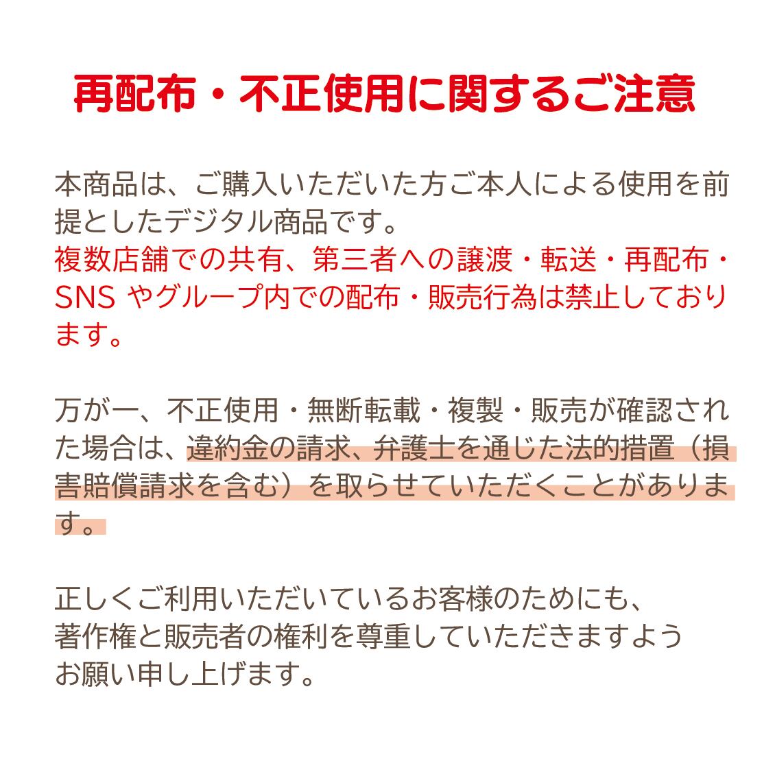 ・複数店舗での共有、第三者への譲渡・転送・再配布・SNSやグループ内での配布・販売行為は禁止です
