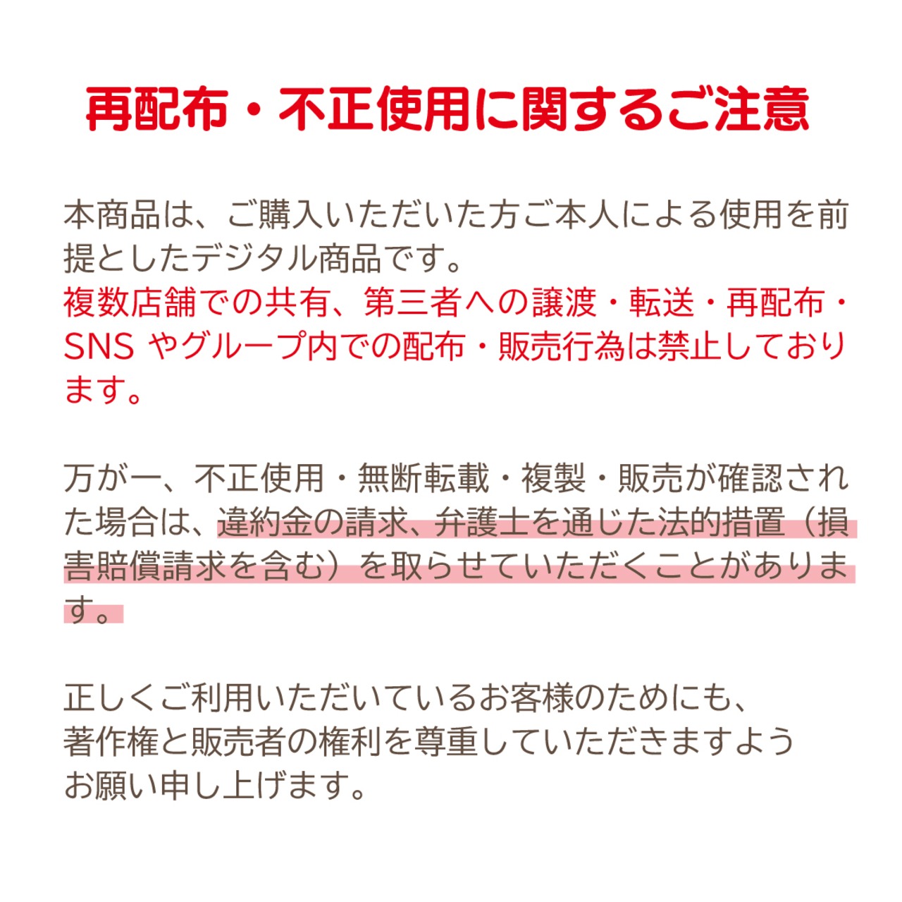 ・複数店舗での使用、第三者への譲渡・転送・再配布、SNSやグループ内共有、再販売は禁止しています