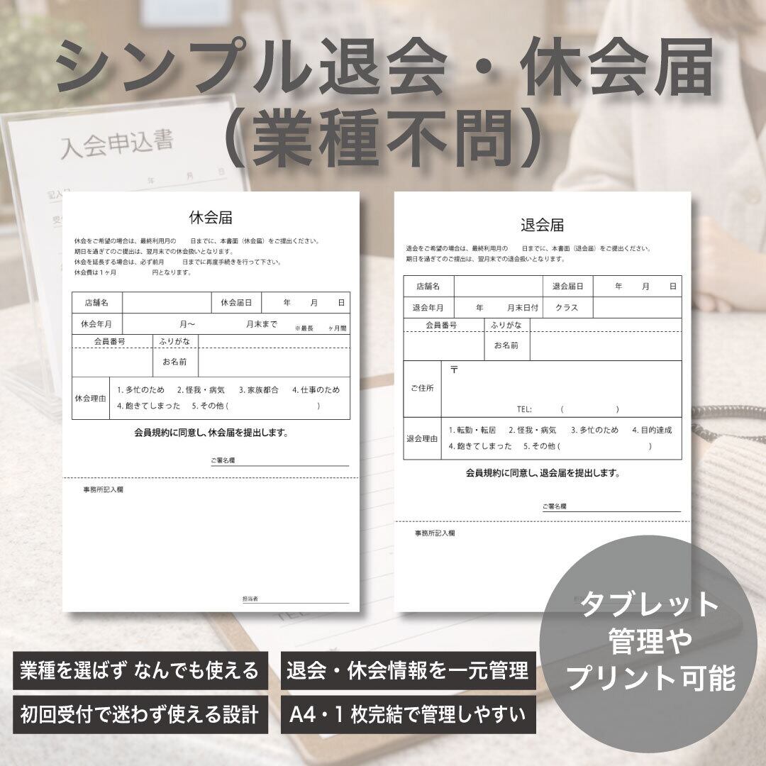 退会や休会手続きのためのシンプルで使いやすい「印刷可|シンプル退会・休会届【PDF・GoodNotes対応】」が新登場しました。このデジタル商品は、手続きをスムーズにするためのテンプレートです。印刷とデジタル利用の両方に対応しています。
