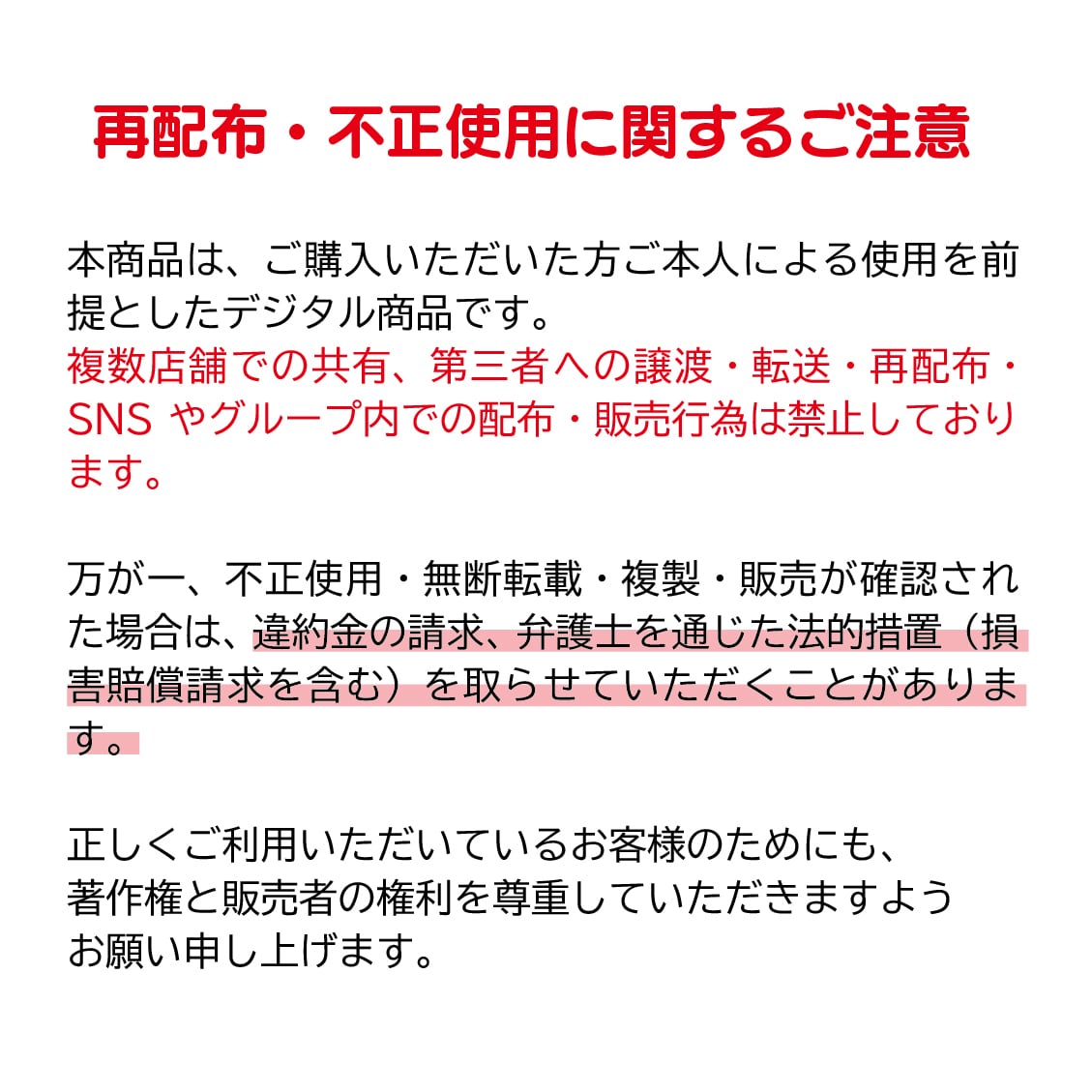 不正使用や無断転載、複製、販売が確認された場合には、違約金の請求や法的措置が取られる可能性がありますので、正しくご利用いただきますようお願いいたします。