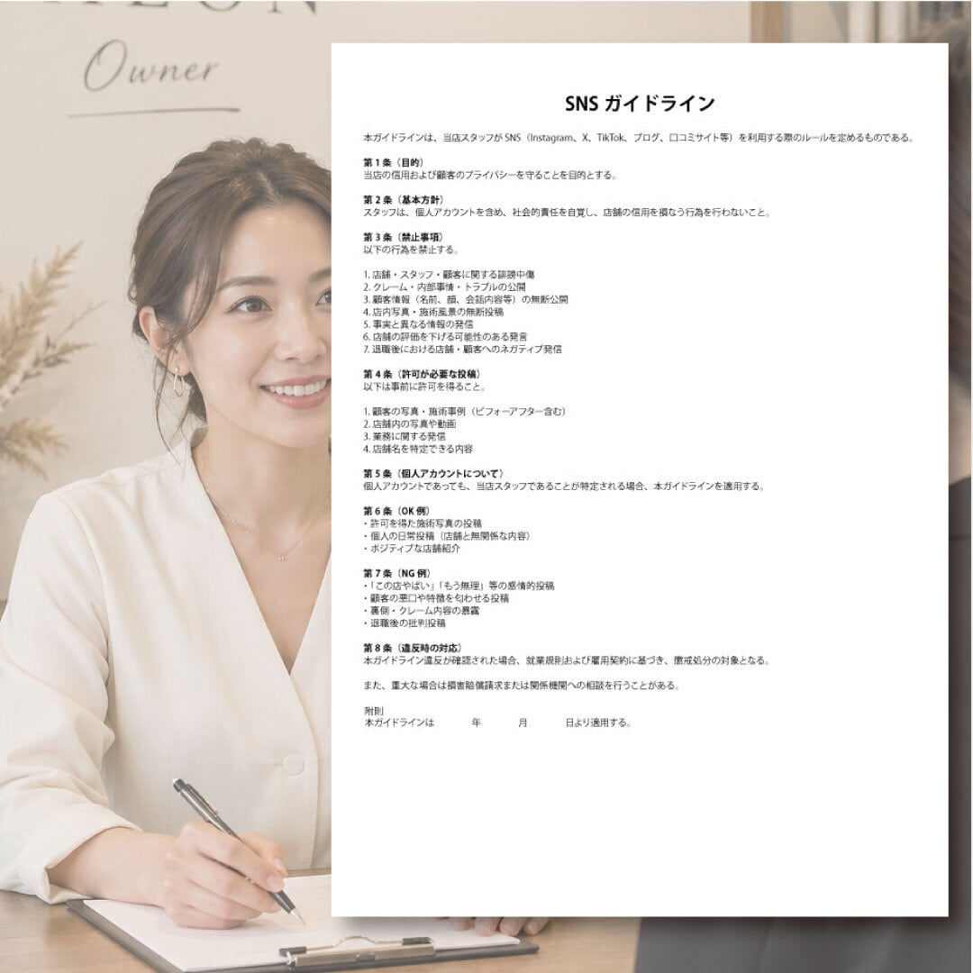 雇用契約・退職時の手続き・SNS運用ルールまで、現場でそのまま使える内容に整えています。